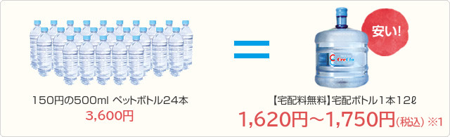 - 1本(12L)1,620円~1,750円(税込) 500ml当たり約68円